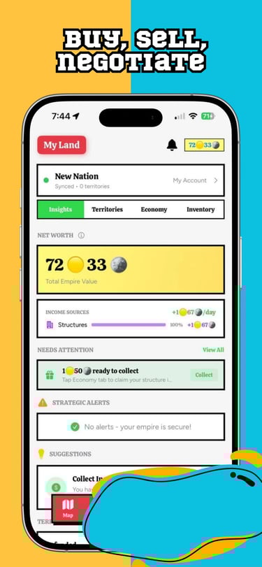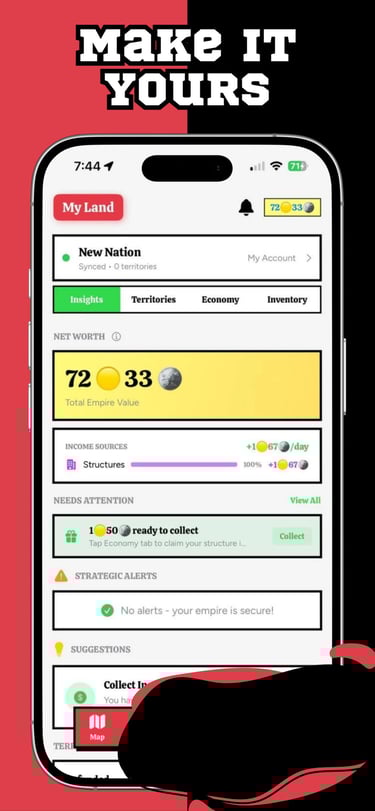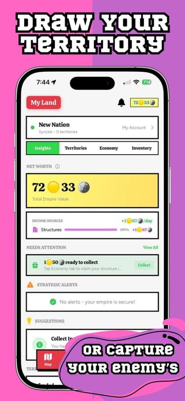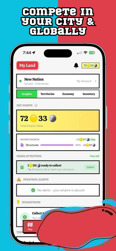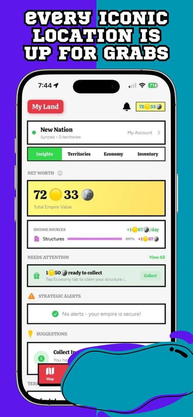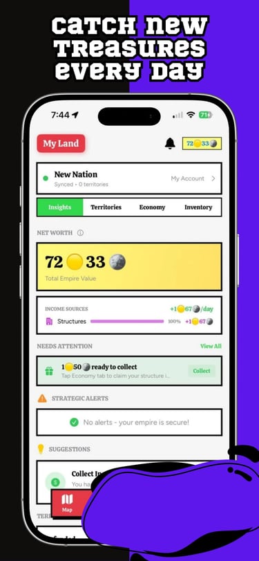 Earn coins from territory control, conquests, and time-limited treasures that appear and vanish across the real map.